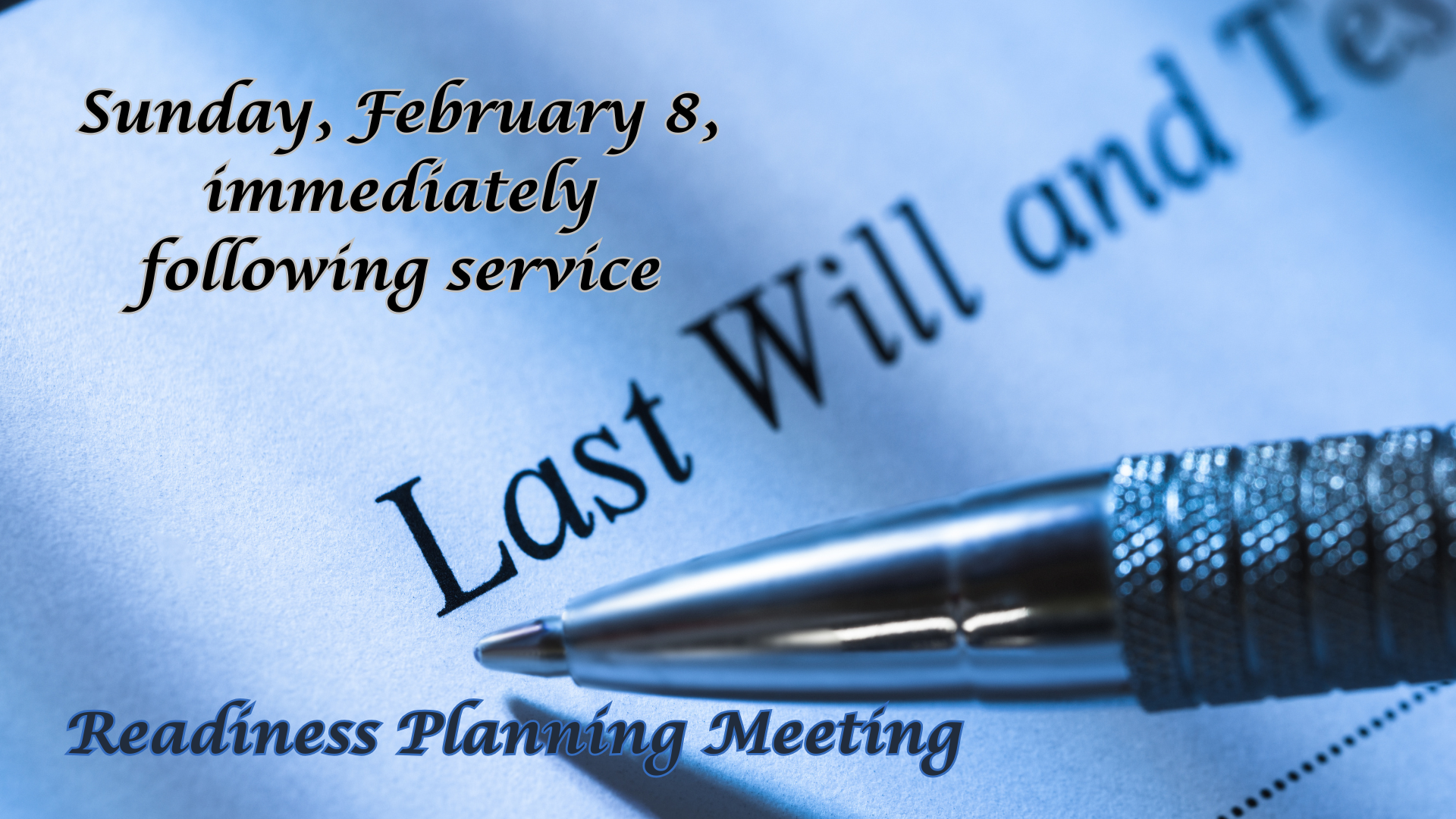 Our Elders are offering a Readiness Planning Event immediately following the service on Sunday, February 8, to get you crucial information on vital matters like wills, advance directives, medical power of attorney, and the like. You must sign up for this event, and a boxed lunch will be provided for all those who do. Click here to sign up.
