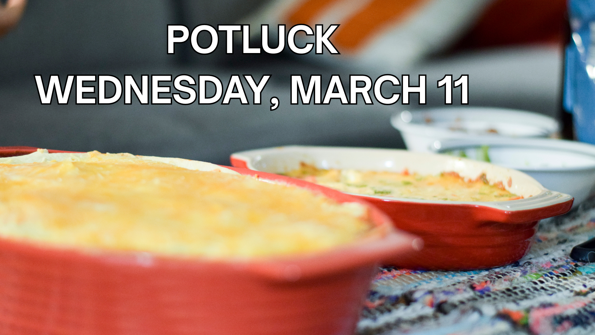 Next Wednesday, March 11, in lieu of our regular TGIWednesday gathering and Revelation study, we will instead have a potluck meal and time of worship. The church will provide fried chicken and drinks, and we're asking you to BRING A SIDE DISH OR A DESSERT TO SHARE. Our Revelation study will resume the following Wednesday, March 18.