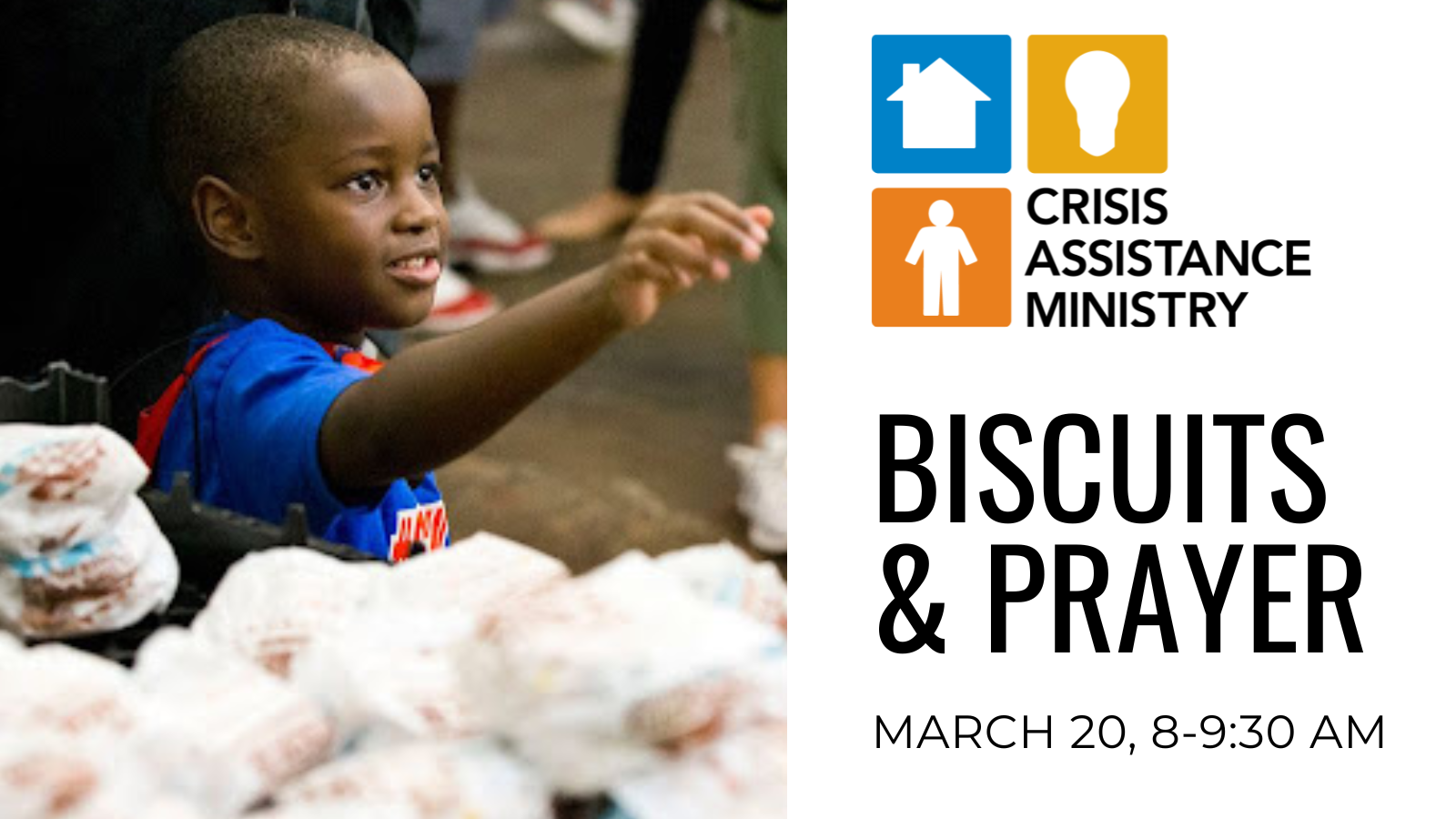 On Friday, March 20, from 8-9:30am, we're going to Crisis Assistance Ministry to offer biscuits, encouragement, and prayer to those waiting in line for financial assistance. If you'd like to join us, click here to sign up.